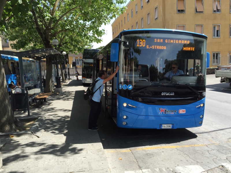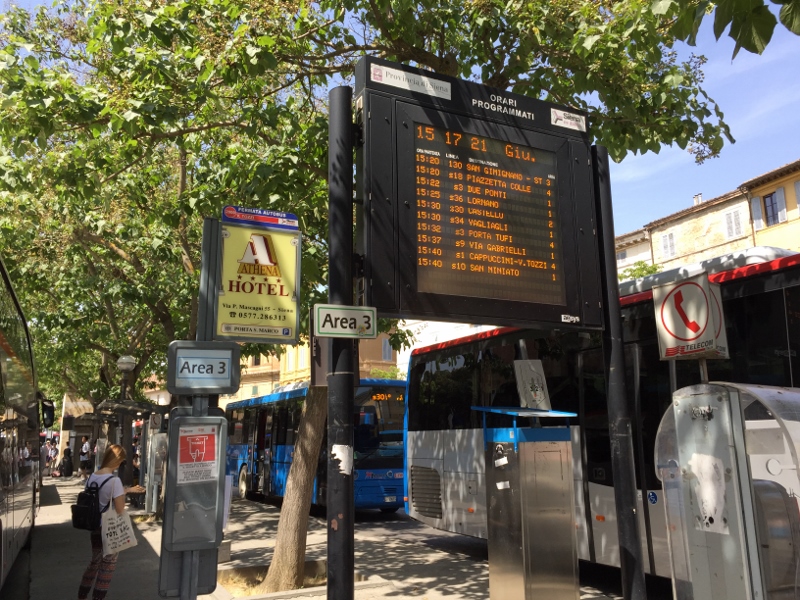 There is a digital Timetable sign board at the south end of the island that displays incoming buses and arrival times. (TIP: It may be amusingly hidden behind an ever-growing tree that blocks good viewing. You need to walk right up to it, until someone decides to cut the tree down, which does provide much-needed shade and comfort.) Buses will parallel park on the far side of the narrow island anywhere there is space along its length. About 5-10 minutes before scheduled departure, look at the front of the buses for the destination and number board above the windshield (e.g. San Gimignano 130, see below). All buses have route numbers that correspond to those listed on the Tiemme web site. Keep in mind that bus drivers often take a break or change drivers after the buses arrive from elsewhere, so you may not be able to board or see its digital sign on front until only a few minutes before. Just hang around the area (or suspected bus) until you see some activity.
