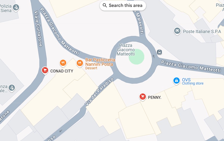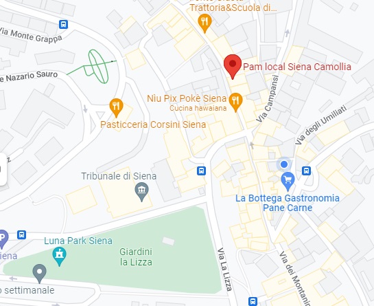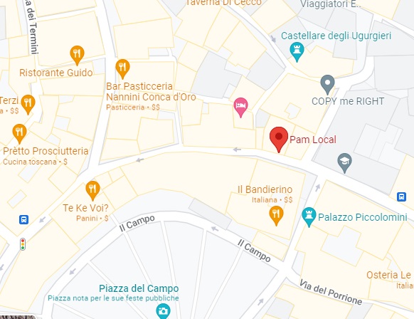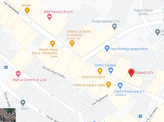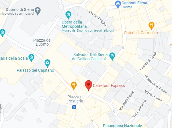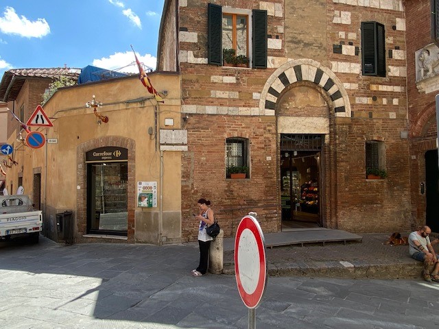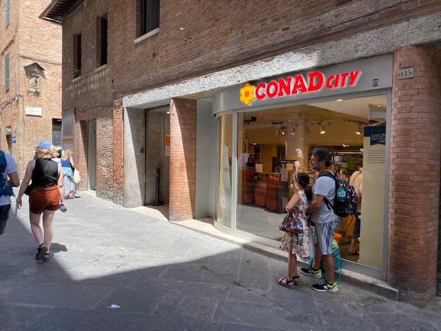 Finding grocery stores and larger supermarkets in Siena is not always easy or intuitive, though shopping at them provides for a rich cultural experience. These businesses occupy centuries-old buildings in many cases, sometimes revealing unique floor plans that only add to their local character. This page provides an overview of comprehensive if modest urban grocery stores in or near the city’s historic center, with maps and some photos below where more locational detail may be necessary. They are all walkable within the walled city (except those near the train station), though certain stores will be closer to you than others depending on where you are staying. NOTE about map apps: If you have decent cell or internet service while in town, you can search on a map app for “grocery stores near me,” though many of those included are specialty stores without comprehensive grocery selections. They are still unique and are part of the local/regional culture, so certainly worth visiting!