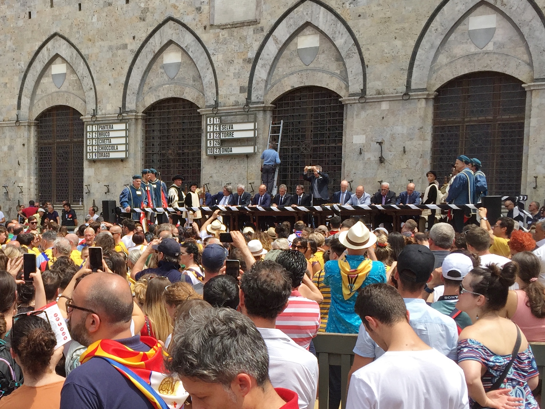 Perhaps wisely, the extraction (drawing) is carried out with complete transparency, for all in the Campo—and nowadays on television—to witness in front of our eyes. The city’s mayor personally announces the matches from a raised stage. The whole affair is elegantly simple, in marked contrast to the passion it evokes among the contradaioli. Upon drawing a printed slip marked with a number from one to ten, the slip is handed to the mayor who in turn proceeds to read it to the crowd. The numbers have already been matched with the final ten horses chosen to race in the Palio, displayed prominently on large boards attached to the Palazzo Pubblico. To eliminate any suspicion of conspiracy, the mayor simultaneously holds the number at arm’s length for all of us to see. Following his announcement of the number, the second slip of paper is drawn from a similar tumbler to select the horse’s assigned contrada. As this second drawing takes place, the Campo turns eerily silent as the suspense rockets higher. Upon receiving the drawn slip, the mayor publically announces the contrada. The human reaction from the crowd is instant and passionate, though the particular emotion projected depends entirely on one’s perspective. Emotions range from incomparable elation to utter disappointment. Their reactions can also be deceiving, as one contrada might celebrate because its rival extracted a less desirable horse. (End Excerpt)