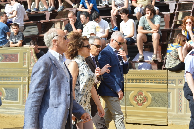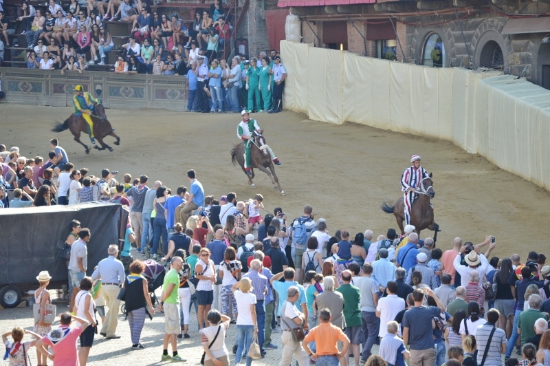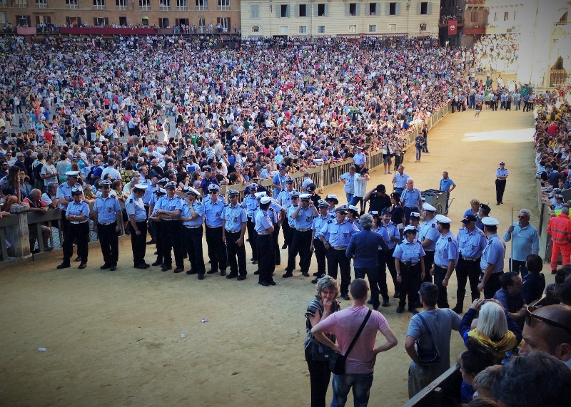 To give yourself plenty of time to orient to the Campo scene, I suggest arriving in the Campo between 8:30 and 8:45, before the line of police begin to “clean” (clear) the track of humans. They do this progressively around the track starting at 9:00. After this, they close off the center so that people can no longer enter or exit. I also suggest sunscreen, hats, and snacks, especially for children as well as adults. There is a whole process to the trials (similar to the Palio), with the police slowly “clearing” the track of human bystanders, then picking up trash on the track, then city officials and captains making their way to the judges’ stand.