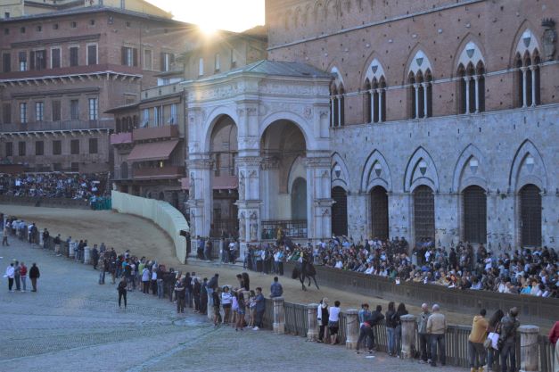 For visitors not yet familiar with the Palio, the tratta provides a nearly stress-free way to enjoy learning about this centuries-old race. If one shows up in the center of the Campo about a half hour before it begins (say, an 8:30 AM arrival for the 9:00 start in July), it is easy to find a great view along one of the barriers to enjoy the otherwise odd sight of horses careening around a European city square with hopeful jockeys trying desperately not to fall off. This is not something to be taken for granted or taken lightly.