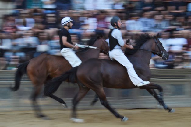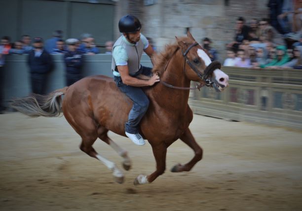 One might wonder how horses are chosen for the Palio. The reality is that most horses offered up by their hopeful owners only have a slim chance of making it to Palio day. While more than 100 horses are often placed in contention for possible Palio consideration, only ten are allowed to race. It is safe to say that most Siena visitors looking forward to the Palio don’t get to see the highly involved process of selection and testing that occurs behind the scenes, and weeks in advance. Guiding the entire process is a highly prescribed approach spelled out within a rigorous set of protocols for the care, treatment, and training of Palio horses. There is even a specially constructed track “simulator” located outside of Siena, in the village of Mociano. As a virtual replica of the track in Piazza del Campo, the Mociano training grounds allow jockeys and horses alike to experience certain Palio conditions and to judge whether a particular horse is capable of handling the real thing.
