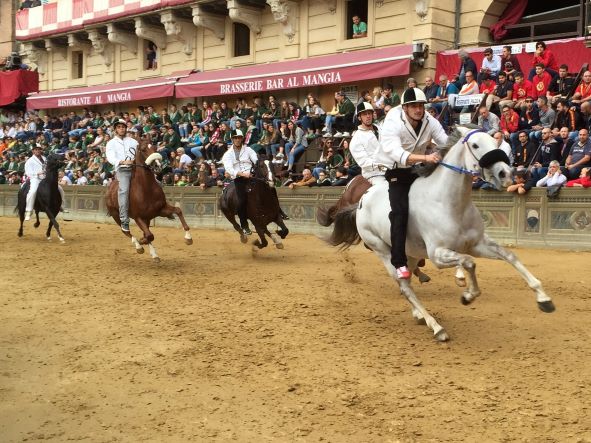 The tratta marks the first of the four days of the Palio and is held approximately between 9:00 and 11:00 AM in the Campo. Usually around 30 steeds make it to this phase, which means there is still only a small chance of a particular horse being chosen for the final race. This is the first event we can see horses run in pseudo-Palio conditions. Batteries of 5-7 horses line up at the mossa (starting line) and practice launching together off the starting line. They might appear to be racing for some time, so the start of each battery can be an exciting and adrenalin-filled affair. Once launched from the mossa, however, jockeys can slow down and train their respective steeds on any number of skills. At this stage, jockeys are not yet wearing their specific contrada outfits, since the horses have not yet been matched by lottery to the contrade that will race them. Instead, it’s fun to see all jockeys wearing the same black-and-white outfits that represent the city’s official “balzana,” or herald. Occasionally the less experienced jockeys can be seen flying off their steeds at the most hazardous turn of San Martino, leaving their confused steeds to humorously run around the track until they finally run out of energy. Usually five or six batteries of horses are run, with a few horses sometimes included twice if more evaluations are warranted.